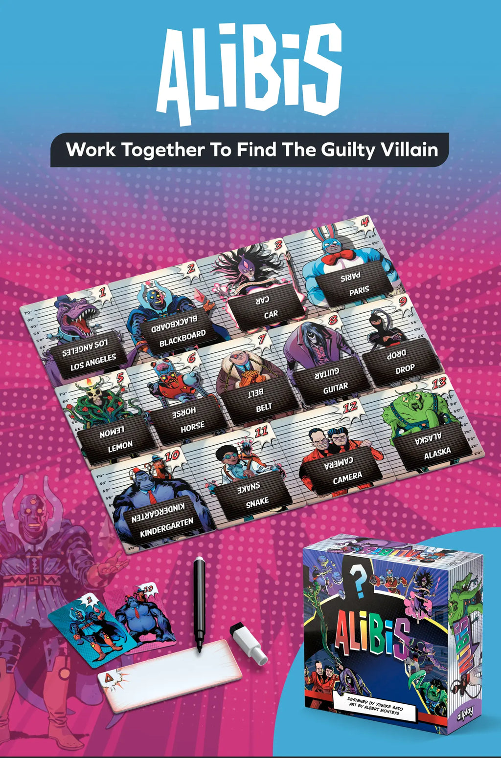 At the start of the game, you’re secretly given information about two innocent suspects. Cooperatively, associate your two characters with a one-word clue. If everyone does that correctly, you’ve found the culprit!