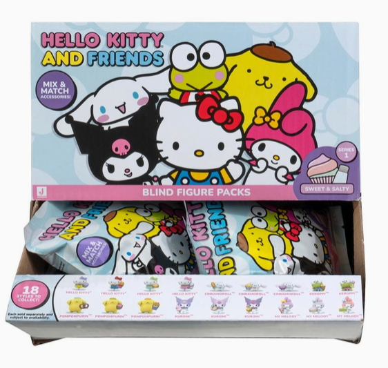 Unwrap the charm of Hello Kitty™ and Friends with this 12pc counter display featuring 2-inch blind-pack collectible figures. Each surprise pack includes one mix-and-match character in a fun food-themed outfit. With 18 unique styles to discover, this display offers big appeal in a small footprint. Key Features: • Includes 12 individually blind-packaged figures in CDU
