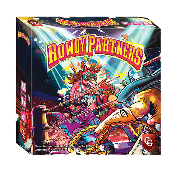 Rowdy Partners is a team trick-taking game played over a series of rounds, with each round being composed of eight tricks. For games with fewer than four players, "Headliner" rules apply, where a single player acts as a one-person team with a Manager, playing two cards per trick. Work with your partner to beat the other players by draining their health through calculated strikes and sneaky counters. Swap wrestlers mid-match, unleash signature moves, and collect Pop to gain the upper hand. The team that first pins one of their opponents