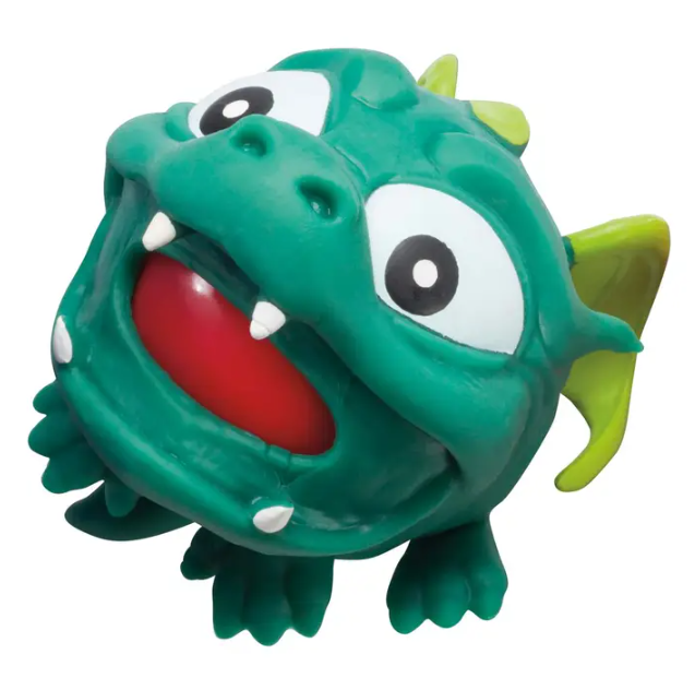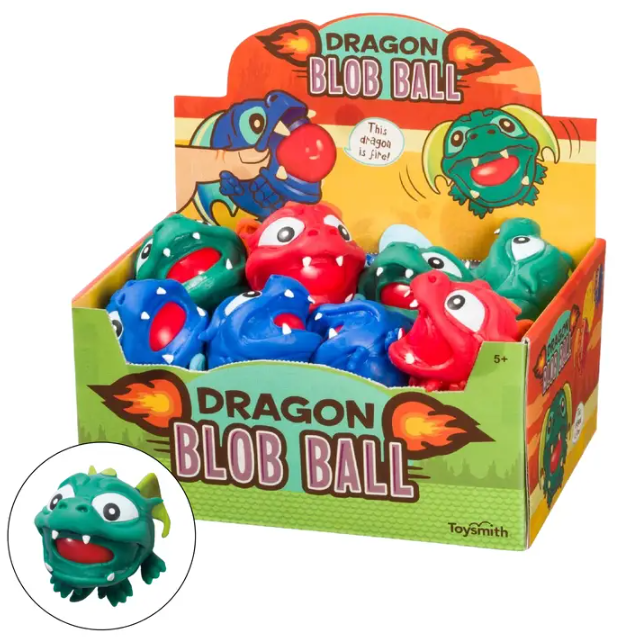 The Dragon Blog Ball squish toy comes in 3 assorted color options including red, blue, and green. Each 3-inch dragon squeeze ball features a wide-open mouth with pointed white teeth and a peeking tongue. Raised spiky ears and giant eyes make this dragon adorably ferocious. Squeeze its cheeks and the fire erupts! A great stress relief aid or soft ball for tossing around. Available with colorful display case showcasing how to squeeze the dragon’s cheeks and make a fire blob erupt! •