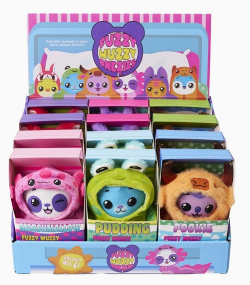The Fuzzy Wuzzy™ Onezies Plush Assortment features adorable animal friends in colorful, removable hooded onesies. Each plush has a soft, fuzzy texture and big, expressive eyes that make them extra huggable and collectible. Key Features: • Includes 6 unique plush characters dressed in removable onesies • Soft, fuzzy fabric with embroidered facial details • Fun surprise element—who’s hiding under the hood? • Perfect for collecting, gifting, or pretend play.