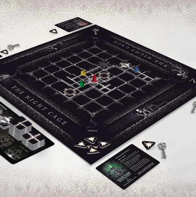 The Night Cage is a cooperative, horror-themed, tile-placement game that traps 1 to 4 lost souls within an otherworldly labyrinth of eternal darkness. Each prisoner has only a candle to aid them in their escape. But its weak light can only illuminate the passages directly adjacent to them. As players move, new pathways are revealed while old ones disappear, consumed in the darkness forever. Every move will require thoughtful consideration and collective strategy to keep your candles burning long enough to find the way out. Tense and dripping with theme, The Night Cage is a challenging puzzle to navigate, which can be made easier or more difficult to adjust to your play group.